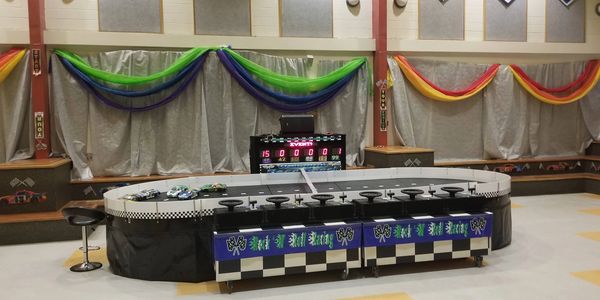 Roughly 3 times the size of our Mini Mile, our 16x28' Super Speedway is undoubtedly a sight to see, and unquestionably, a behemoth, at that! The perfect fit, especially for your crowd to gather and watch in amazement as they cheer their favorite driver on, banking around the corners in this feverish fight to the finish. Works very well for the little tikes to see, as this track sits much lower to the ground, as well. This track also handles 6 drivers at a time and handles 150 racers per hour, as well. The total space required for this track is 20' x 30', and two hours are required for setup. This can be set up either indoors or out.