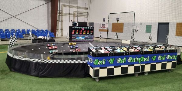 The smaller version of our two tracks, our 8x20' Mini Mile delivers an action-packed punch of excitement, just as well! This track may be smaller, but it still comes through in terms of big-time fun! This track can handle up to 6 drivers per race, resulting in up to150 racers per hour! It comes complete with the LED scoreboard you see here, 6 driving stations/cars, our PA system, and some family-friendly tunes playing off our speakers, as well, as you race to your heart's content on your way to the top! Our announcer will keep everyone engaged and informed in this survival of the fittest. The total space required for this track is 15' x 25', and two hours are required for setup. This can be set up either indoors or out.